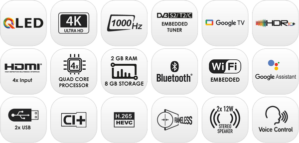 Τηλεόραση Google TV 85" Frameless QLED — Με τηλεχειριστήριο Bluetooth — Φωνητικές εντολές — HbbTV — Ιδανική για Cosmote TV, Nova (EON), Ertflix, NETFLIX…, Επίγειος Ψηφιακός DVB-T2 /Δορυφορικός DVB-S2 / Καλωδιακός DVB-C και CI+. Με λειτουργικό GoogleTV, Wi-Fi, Chromecast.